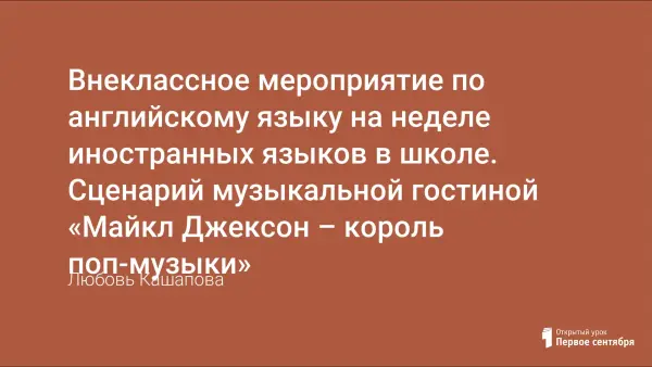 Сценарий музыкальной гостиной посвящен памяти популярного американского музыканта, композитора и исполнителя Майкла Джексона. Мероприятие проводилось на неделе иностранных языков для старшеклассников.