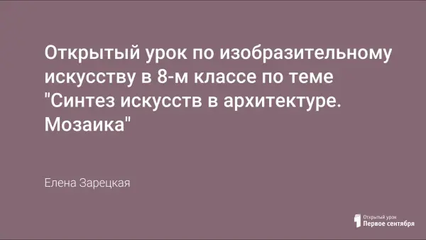 В разделе и курсе изобразительного искусства тема "Синтез искусств в архитектуре" занимает важное место. На её изучение отведено значительное время - II полугодие 8-го класса. Урок способствует закреплению знаний о видах изобразительного искусства, о синтезе искусств в архитектуре; позволяет сформировать представление о мозаике, как о виде монументального искусства; развивает навыки работы с бумагой в технике аппликации, воспитывает уважительное отношение к мнению одноклассников и их работам.