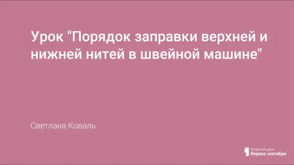 Урок из раздела Машиноведение "Порядок заправки верхней и нижней нитей в швейной машине" в 5-м классе, расчитанный на 2 часа и проходит после знакомства с назначением и устройством швейной машины. Это комбинированный урок: изучение нового материала и практическое его закрепление.