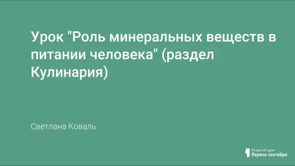 Автор в статье дает общие сведения о значении минеральных веществ в жизнедеятельности организма; учит пользоваться таблицами для составления сбалансированного питания в минеральных веществах на каждый день. Продолжает воспитание внимательного отношения к своему питанию, прививает навыки культуры труда, внимательности и аккуратности.