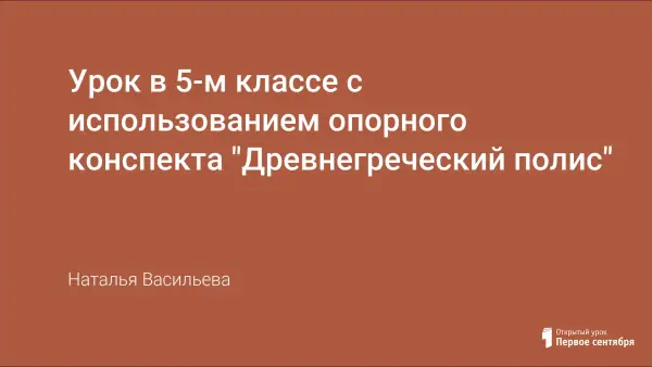 Урок для 5-го класса подготовлен по учебнику С.В. Колпакова "История Древнего мира. 5-й класс". На уроке используется опорный конспект, который располагается на доске и каждый ученик в процессе урока заносит его в свою тетрадь. По ходу объяснения нового материала учитель объясняет схемы и таблицы в опорном конспекте. Параллельно с опорным конспектом заполняется словарь терминов. Дома учащиеся используют вопросы для самопроверки.