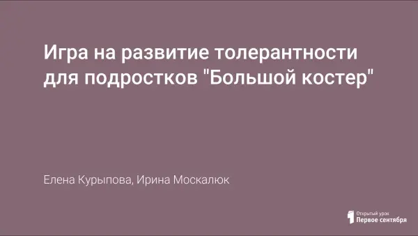 В настоящее время подростки все чаще испытывают трудности при общении, особенно если отношения приходится строить по принципу "свой-чужой". "Большой костер" - игра на развитие толерантности для подростков, в которой учащимся дается опыт личного проживания ситуации общения с "чужими" и "своими". Количество участников - от 15 до 30 человек.