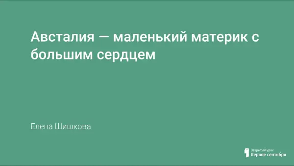 Урок "Австралия - маленький материк с большим сердцем", взят из курса географии 7-го класса. Урок был разработан и апробирован на уровне КМО учителей географии, при аттестации на категорию где получил оценку "отлично". Для проведения данного урока было дано задание обучающимся, по приготовлению небольших сообщений, которые были заслушаны в ходе урока.