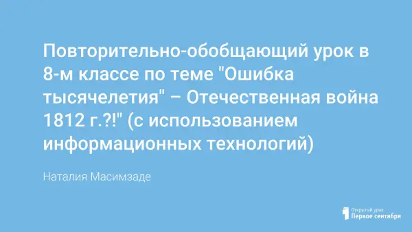 В 2000 г. в связи с «миллениумом» составлялись списки по номинациям: «Человек тысячелетия», «Открытие тысячелетия», «Событие тысячелетия». «Ошибка тысячелетия» была совершена в XIX веке, а потом повторена в XX веке. Урок посвящен повторению и обобщению знаний учащихся об Отечественной войне 1812 года. Применение информационных технологий и интерактивной доски SMARTboard делает урок эффективным, наглядным, динамичным, что, в свою очередь, повышает успеваемость учащихся и их заинтересованность предметом.
