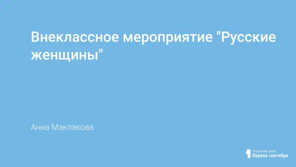 Данная работа представляет собой внеклассное мероприятие в 9–10-х классах. Цель мероприятия – воспитание чувства глубокого уважения к русской женщине.
