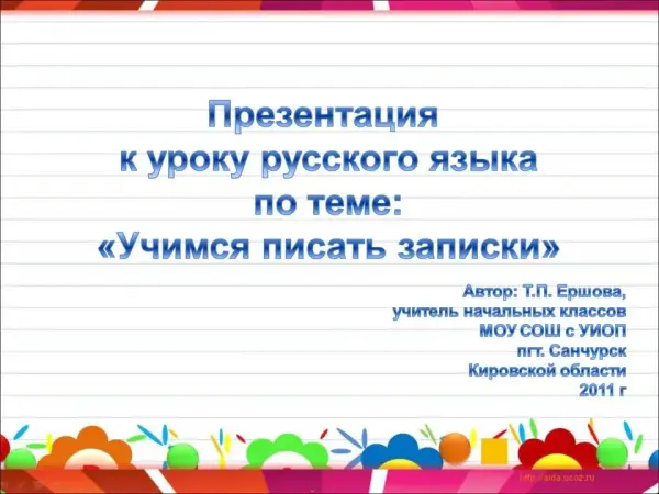 Урок русского языка разработан с учетом стандартов ФГОС НОО; знакомит с запиской как видом сообщения информации; учит составлять записки разные по назначению; закрепляет знание о правилах написания предложения и имен собственных. К уроку приложена технологическая карта.