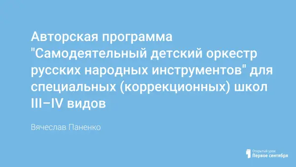 Цель авторской программы: научить незрячих воспитанников игре на народных инструментах, воспитать любовь и бережное отношение к русскому народному творчеству, развить творческие способности и музыкальный вкус.