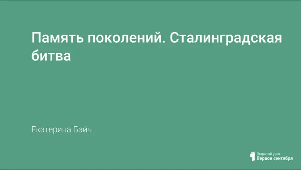 Урок духовно-патриотического воспитания с использованием мультимедийных средств обучения. Изучение темы "Сталинградская битва" является составной частью цикла уроков и мероприятий "Память поколений", посвященного Победе в Великой Отечественной войне. Организация урока в форме проектной деятельности учащихся позволяет не только создать целостное представление о роли Сталинградской битвы в ходе войны, но и погрузиться в эпоху, понять и прочувствовать её на основе работы с историческими источниками.