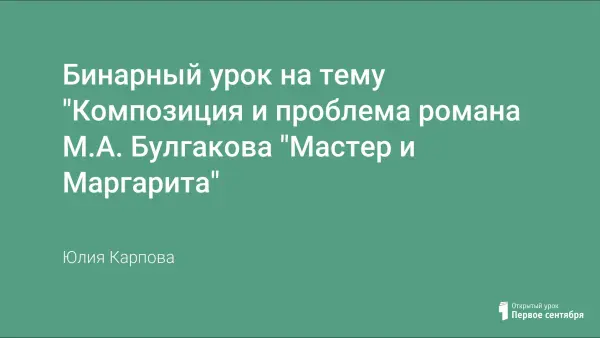 Роман М.А. Булгакова «Мастер и Маргарита» вызывает неизменный интерес учащихся, однако понять философскую глубину произведения помогает именно анализ композиции и системы образов произведения. Кроме того, «закатный роман» Булгакова необходимо видеть в контексте и творчества писателя, и его эпохи, и традиций русской классической литературы. Именно эти задачи решает урок.