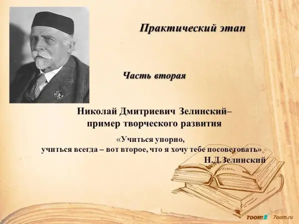 Николай Дмитриевич Зелинский - подлинная энциклопедия научной мысли для исследования. В разработке представлен материал, который включает два этапа: I этап – Теоретический. Научно-познавательный, «…Учись у лучших»; II этап – Практический.