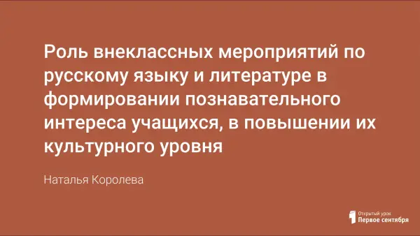 Данная работа рассказывает о деятельности учителя и учащихся во внеурочное время. На конкретных примерах показаны формы совместного творчества педагога и его учеников. Здесь указаны аспекты и пути формирования интереса к урокам русского языка и литературы посредством проведения внеклассных мероприятий с целью углубления знаний в области литературоведения и лингвистики, активизации способностей школьников, развития интереса к изучаемым предметам.