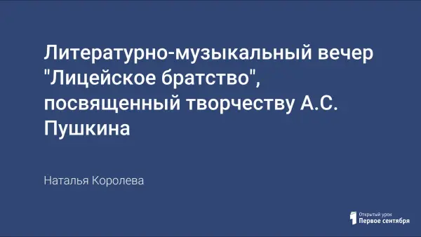 Литературно-музыкальный вечер посвящён памяти А.С. Пушкина. Он состоит из двух частей, каждая из которых представляет собой завершённую линию взаимоотношений: Александр Пушкин - Антон Дельвиг; Александр Пушкин - Вильгельм Кюхельбекер. Данное мероприятие разработано для учеников 9-11-х классов.