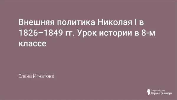 На уроке предполагается использование различных форм обучения, что позволяет систематизировать обширный материал по внешней политике Николая I. Учащиеся должны усвоить основные направления, события внешней политики 1826–1849 гг., сделать вывод об их взаимосвязи с внутренней политикой.