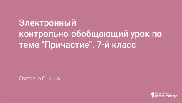 Электронный урок нацелен на обобщение и систематизацию знаний по теме "Причастие". Проверка прочности знаний проводится с использованием ИКТ. В уроке сочетаются различные дифференцированные задания (от простого к сложному).