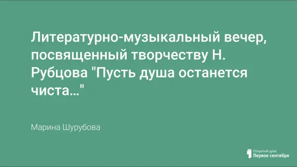 Творчество Николая Рубцова, выдающего русского поэта, нередко сравнивают с лирикой Сергея Есенина. В сценарии отражены основные вехи жизненного и творческого пути поэта, использованы воспоминания современников Н. Рубцова. Выступления конкурсантов сопровождаются презентацией и музыкальными композициями.