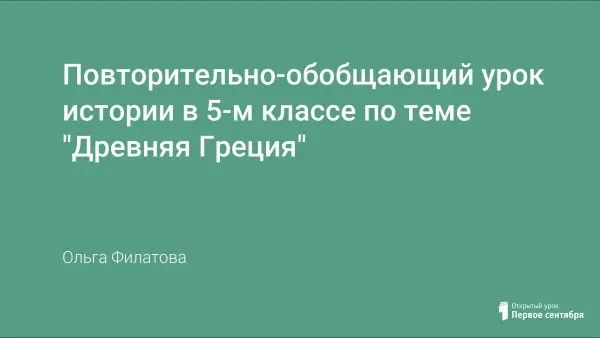 На уроке происходит повторение и обобщение материала по Древней Греции, вовлечение учащихся в творческую деятельность, основанную на любви и интересе к предмету "история". Особое внимание уделяется духовной культуре эллинов и роли античного наследия в современном мире. Урок проводится в основной школе после изучения истории Древней Греции. Задачи урока - развивать умение работать в группах и коллективе, умение слушать и высказывать свое мнение, отстаивать свою точку зрения.