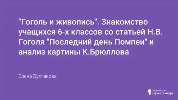На уроке ученики узнают об отношении Н.В. Гоголя к живописи, увидят, как он в своей статье анализирует полотно К.Брюллова "Последний день Помпеи", сравнят его словесный анализ с наглядным изображением трагического события. Дети увидят и почувствуют, как мастерски умеет Гоголь живописать словом то, что дано на картине.