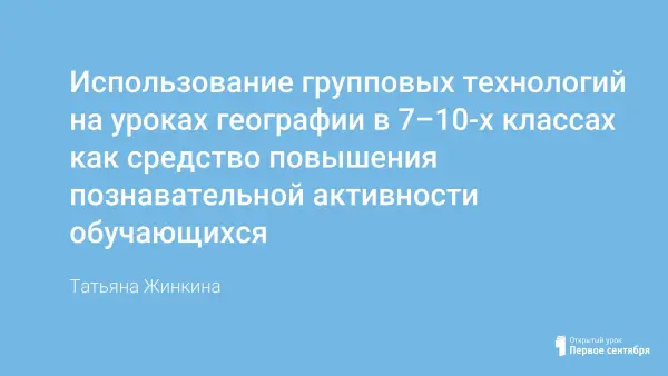 Использование групповых технологий на уроках географии решает комплекс задач, направленных на интенсификацию учебного процесса, развитие самоуправления, коммуникативности, взаимопомощи, отработку практических умений и навыков. В процессе обучения создается комфортная психологическая ситуация для всех обучающихся.