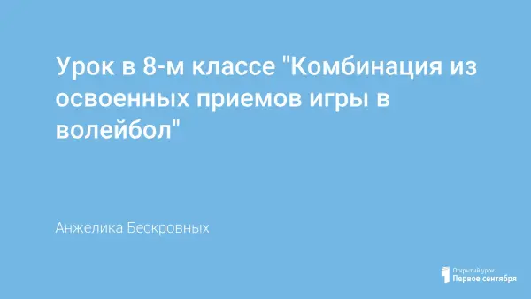Урок в 8-м классе "Комбинация из освоенных приемов игры в волейбол" направлен на закрепление изученных приемов техники владения мячом. В структуру урока входит самооценка учащимися выполнения упражнений по ОФП и техники владения мячом.
