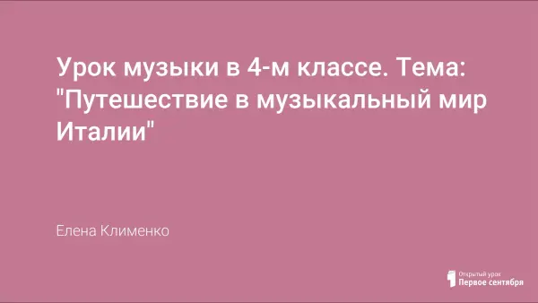 Урок-путешествие по теме полугодия «Между музыкой моего народа и разных народов мира нет непереходимых границ» драматургически построен на использовании итальянской народной музыки и произведений русских композиторов, написанных в духе итальянской народной музыки, что позволяет подчеркнуть общность культур двух стран, интонационную близость и контрастность мелодики.