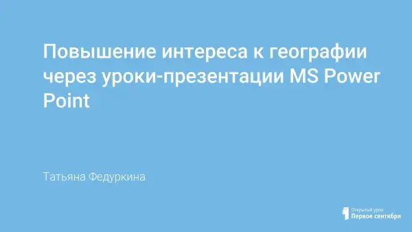 Один из путей повышения интереса к географии сегодня - создание мультимедийных презентаций. Презентация усиливает динамику урока, позволяет завоевать внимание учеников. Дает возможность учащемуся реализовать себя, создает ситуацию успеха. Формирует новый взгляд учителя на личность ребенка, способствуя развитию творческих способностей. Презентация делает урок наглядным, выразительным, помогает лучшему усвоению нового материала. Практика показывает широкий интерес школьников к таким урокам.