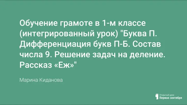 На уроке учащиеся решают задачи на деление посредством моделирования, уясняют дифференциацию звуков [п]-[б] через развитие фонематического слуха, на основе наглядности рассматривают состав числа 9. Развивается внимание при буквенной записи слов, память, мышление; совершенствуется навык чтения и письма.