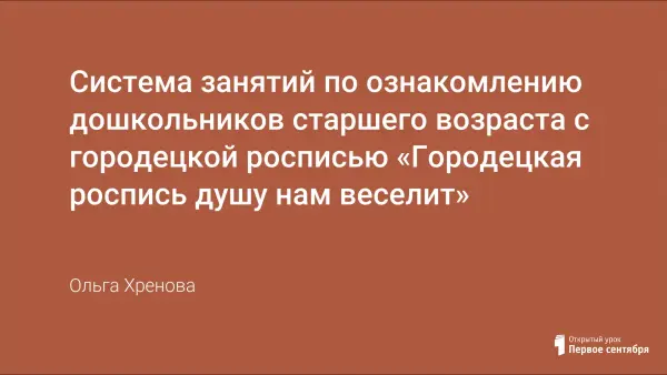 Цель занятий: познакомить с историей городецкого промысла; развивать творческие способности; учить видеть особенности городецкой росписи: основные цвета, оттенки цветов, их сочетания, взаимосвязь цвета, фона и узора; учить рисовать элементы городецкой росписи, развивать чувство композиции, умение составлять узоры на листе бумаги разной формы; учить рисовать гуашью, быстро свободно без предварительной прорисовки, крупные формы и мелкие детали, украшения (дуги, черточки, точки).