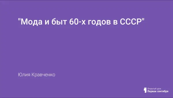 Урок может помочь ученикам глубже понять эпоху 60-х годов на основе повторения изученного в теме и самостоятельного подбора фактического материала по отдельным годам периода и его творческого осмысления. Цель: сформировать у школьников многоплановый стилевой образ 60-х годов, познакомить их с веяниями моды, повседневной жизнью, досугом и отдыхом людей в СССР.