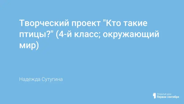 Творческий проект по окружающему миру в 4-м классе по программе развивающего обучения системы Л.В.Занкова готовится на протяжении 6-ти уроков по 15 минут и во внеурочное время. Проект даёт возможность обобщать и систематизировать знания детей о птицах, определять их по внешним признакам; выявить пробелы в знаниях учащихся; расширить кругозор детей.
