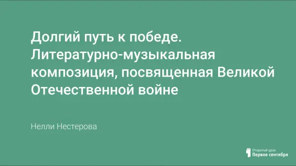 Литературно-музыкальная композиция отражает основные события ВОВ. Используется литературные произведения, музыка, кино-, фотодокументы. Формируется патриотическое самосознание учащихся, гордость за проявленное мужество и подвиги советского народа. Уроки оказывают серьезное эмоциональное воздействие на учеников, содействуют возрастанию их интереса к истории Родины, воспитывают чувство гордости за славное прошлое, активизируют стремление к самостоятельной творческой поисковой работе.