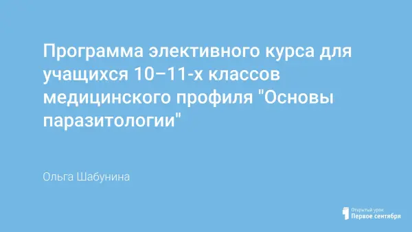 Элективный курс "Основы паразитологии" ориентирован для развития исследовательских навыков учащихся 10-11-х классов, выбравших естественно-научный профиль, а также учащихся, проявляющих интерес к цитологии и паразитологии, и рассчитан на 34 часа.