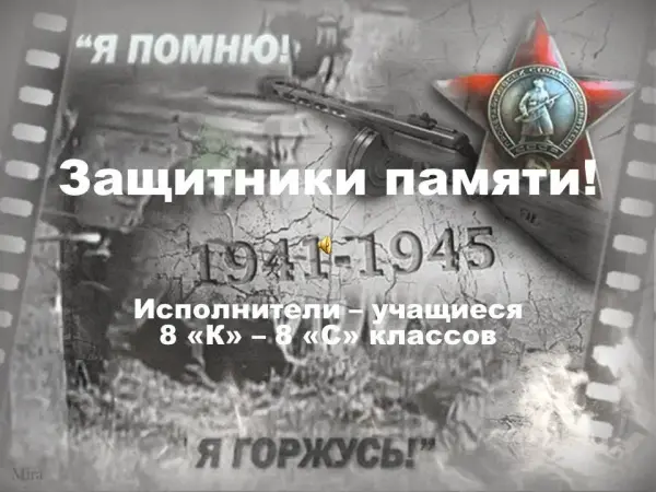 Сценарий «Защитники памяти» написан к фестивалю школьных инсценировок, посвящённых Дню Победы в апреле 2025 года. Материал подбирался исходя из возможностей ребят с ОВЗ (работаю с ребятами со сложной структурой дефекта). Сценарий короткий и ёмкий, легко запоминается. Его просто можно трансформировать под любую группу исполнителей, наполняя содержание или убирая компоненты. Презентация выполнена так, чтобы она была и декорацией, и фоном, и информационной картой для ребят. Все музыкальные слайды ребятами визуализировали действиями, а слайды без звукового сопровождения позволяли произносить реплики.