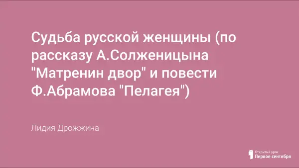 Урок адресован учащимся 9-го класса. В качестве внеклассного чтения им рекомендуется прочитать повесть Абрамова «Пелагея». Задача урока – сравнить судьбы женщин, подчеркнуть их нравственные начала, ответить на проблемные вопросы, поставленные авторами произведений, поразмышлять о смысле жизни.