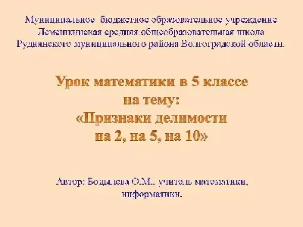 Урок изучения нового материала, в основе которого лежит деятельностный подход для достижения учащимися следующих результатов: формирование коммуникативной компетентности в общении со сверстниками в образовательной деятельности, умения ясно, точно и грамотно излагать свои мысли, способности адекватно оценивать правильность или ошибочность выполнения учебной задачи, понимание сути признаков делимости на 2, на 5, на 10, а также умение устанавливать делимость чисел на 2, на 5, на 10, не выполняя операции деления, развитие способности обосновывать суждения.