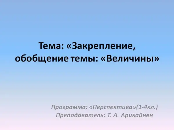 Открытый урок математики в 1-м классе (программа «Перспектива» 1‒4, учебник Л.Г. Петерсон) закрепляет и обобщает тему «Величины». Во время повторения учащиеся работают в группах, делают выводы, при ответах детей заполняется обобщающая таблица. Презентация повышает интерес учащихся к уроку.