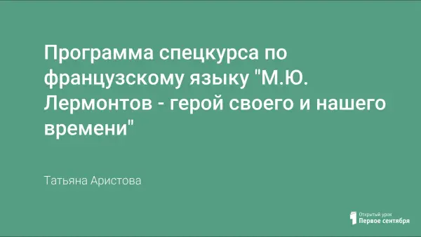 Программа спецкурса "М.Ю. Лермонтов – герой своего и нашего времени" представляет собой дополнение к учебно-методическим комплектам французского языка для общеобразовательных учреждений и является одним из инструментов в формировании социокультурной компетенции. Программа рассчитана на учащихся 5–11-х классов ОУ. Все темы курса интегрированы с темами, изучаемыми по основной программе базового компонента учебного плана.