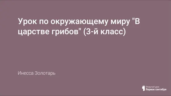 В содержание урока входит рассказ учителя о строении и размножении грибов. Урок сопровождается сообщениями детей о грибах-паразитах (трутовик, спорынья), о плесневых грибах (мукор, дрожжи, пеницилл). А также о пользе грибов для человека и для животных. И в заключении дети узнают о мероприятиях по охране грибов.