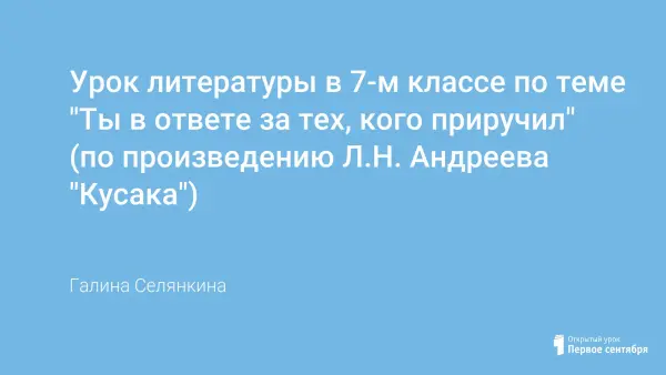 Конспект и презентация урока по рассказу «Кусака». Цели занятия: продолжить знакомство с творчеством Л. Андреева (1871–1919); помочь ученикам увидеть серьёзную нравственную проблему – проблему ответственности человека за свои поступки, проблему выбора, которая стоит перед каждым из нас; на основе данного произведения подвести учащихся к пониманию того, что не только о бездомном и покинутом животном написано это произведение, но и о неприкаянной и одинокой человеческой душе; воспитать чувство ответственности к «братьям нашим меньшим», к природе вообще, а также такие нравственные черты характера, как милосердие, сострадание, отзывчивость, чуткость, душевность; способствовать выработке навыков выразительного чтения.
