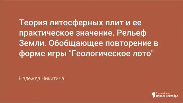 На уроке происходит изучение и закрепление знаний учащихся по теории литосферных плит, на наглядных примерах показывается практическая необходимость и применимость этой теории. В конце урока пройденный материал закрепляется в игровой форме.