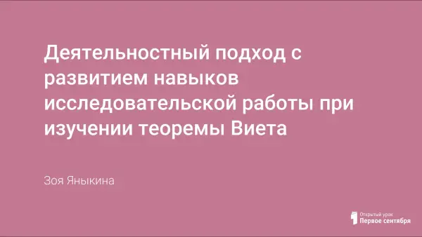 На занятии прививаются навыки математического мышления и исследовательских методов. Освоение деятельности успешно только при прохождении учащимися трех этапов по переводу знаний из внешней формы во внутреннюю. В ходе урока учащимся предстоит сформулировать теорему. Урок алгебры формирует навыки применения теоремы Виета при решении квадратных уравнений. По ним составляется квадратное уравнение.