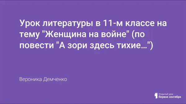 Урок проводится после лекции учителя об основных тенденциях развития литературы военной тематики, принципах изображения военных событий и человека на войне. Произведение "А зори здесь тихие..." должно быть прочитано ребятами к уроку. Создание на уроке эмоционального настроя, соответствующего материалу повести. Главное - вызвать личностный отклик на произведение, рассмотреть поведение героев на войне, проследить, как решается писателем проблема "женщина на войне".