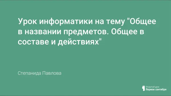 Есть наука информатика, или теоретическая информатика, а есть еще информационные технологии и информационная культура. Поскольку информатика - это фундаментальная дисциплина, формирующая мировоззрение ребенка, она должна преподаваться в школе с начального звена. Для преподавания курса информатики мы выбрали курс безмашинного обучения А.В. Горячева "Информатика в играх и задачах". Курс информатики изучается по блокам. В этом уроке даем описание урока на тему "Нахождение общего в объектах".
