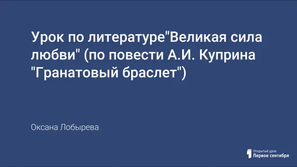 Урок является следующим после изучения биографии писателя. Это урок изучения нового материала, урок-беседа, на котором обучающиеся выявляют своеобразие решения любовной темы в творчестве А.И. Куприна. Тема рассчитана на 2 часа. В ходе урока используются эвристический, частично-поисковый метод, самостоятельная работа, КМД.