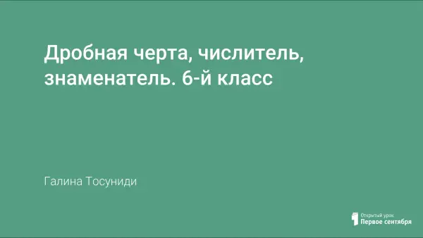 Урок по теме «Дробная черта, числитель, знаменатель» способствует формированию первоначальных представлений об обыкновенных дробях; дает представление о числителе, знаменателе, дробной черте, их месте в записи обыкновенной дроби. Учащиеся научатся составлять обыкновенные дроби, правильно читать их, находить элементы дроби: числитель, знаменатель, дробную черту.