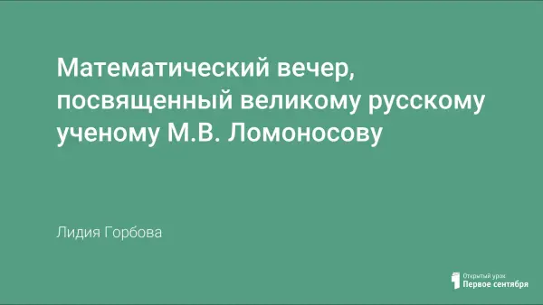 Математический вечер посвящен великому русскому ученому М.В.Ломоносову. Учащиеся знакомятся с основными вехами его жизненного пути и его открытиями. Различные виды задач формируют позитивное отношение к изучению математики и показывают, что она "живая" наука.