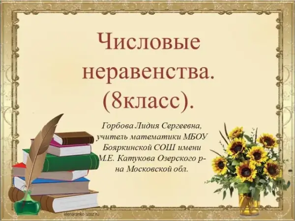 Цели урока: дать понятие числового неравенства; сформулировать свойства неравенств; научить применять их при доказательстве неравенств. Данную презентацию можно использовать не только при проведении урока-лекции, но и при проведении трех обычных уроков: «Числовые неравенства», «Свойства числовых неравенств», «Сложение и умножение числовых неравенств», а также на уроке «Решение неравенств с одной переменной».