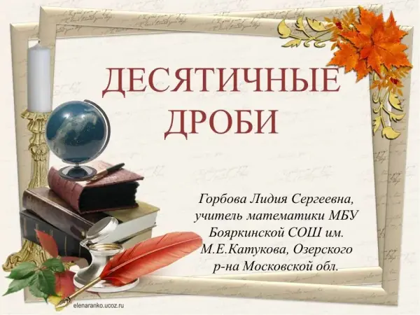 Цели урока: сформировать понятие десятичной дроби; научить читать и записывать десятичные дроби; научить переводить десятичную дробь в обыкновенную и наоборот. Данную презентацию можно использовать не только при проведении урока, но и при закреплении полученных знаний на других уроках и при повторении на первых уроках в 6-м классе.
