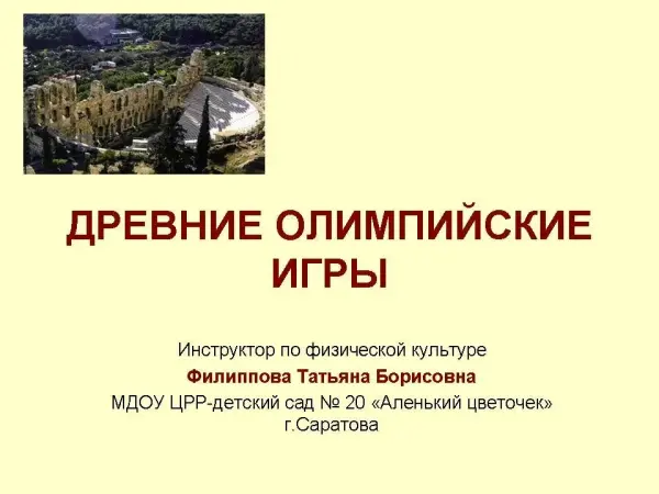 В презентации детям подготовительной группы на наглядной основе и доступным языком рассказывается об истории возникновения Древних Олимпийских игр, о правилах, которые регламентировали проведение таких игр. Дети узнают о видах спорта, которые были основными во время олимпийских игр, о процедуре зажжения олимпийского огня в Древней Греции и о награждении и почитании победителей.