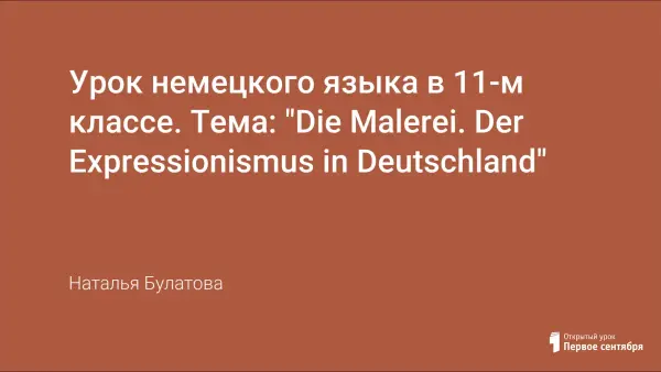 Урок немецкого языка в 11-м классе построен на основе дополнительного материала к учебнику Ворониной Г.И., Карелиной И.В. «Немецкий язык, контакты» для 10-11-х классов, Einheit III “Kreativ Kultur erleben”, Bildende Kunst. На уроке раскрывается значение слова «искусство», учащиеся знакомятся с одним из направлений немецкой живописи – экспрессионизмом, учатся описывать картины.