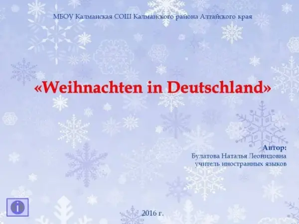 «Рождественский алфавит» – это не обычный немецкий алфавит, который состоит из 26 букв. Этот алфавит содержит 26 слов, которые имеют прямое отношение к немецкому Рождеству. Каждое слово сопровождается комментарием. Имеется презентация с иллюстрациями к данному материалу.